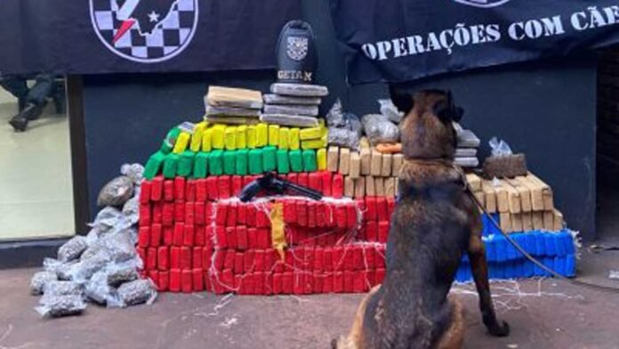Em seguida, a equipe deslocou à residência do indivíduo de 21 anos de idade, onde o cão de faro foi empregado e encontrado no baú de uma motocicleta, uma trouxa de substância análoga a skunk e, em um cama sendo localizado vários tabletes de maconha, totalizando 217 quilos e 500 gramas.