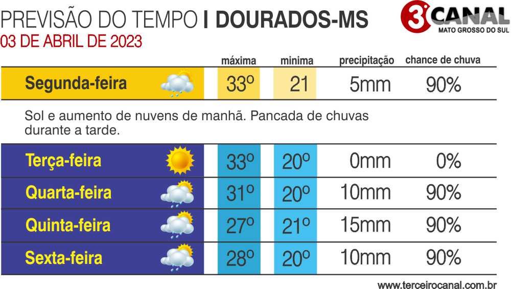 Na Grande Dourados, o Cemtec (Centro de Monitoramento do Tempo e do Clima) indica tempo ensolarado, com temperatura mínima de 21°C e máxima de 33°C. Em Campo Grande, a mínima será de 22°C e a máxima de 31°C. No sul, mínimas serão de 20°C e máximas de 30°C e 33°C. As regiões do leste e do bolsão terão mínimas de 22°C e a máxima de 32°C.