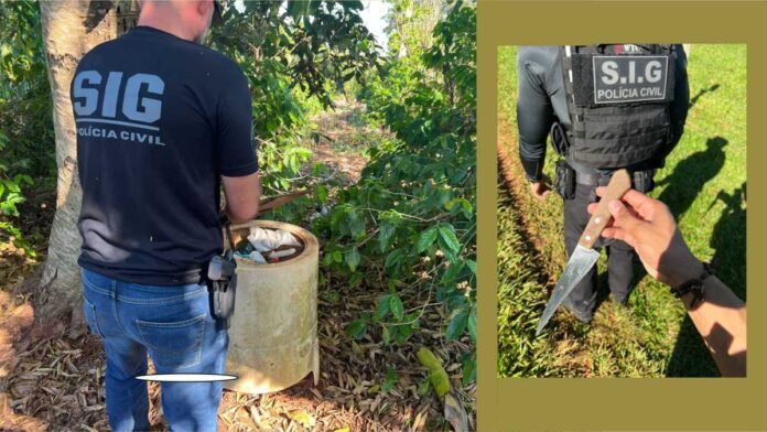 Por meio de trabalho de inteligência policial foi identificada uma área de mata em que o suspeito poderia estar escondido, motivo pelo qual foram realizadas incursões na área rural do Município de Novo Horizonte do Sul, onde o foragido foi capturado. O investigado confessou o crime e apresentou a faca utilizada para matar sua esposa.