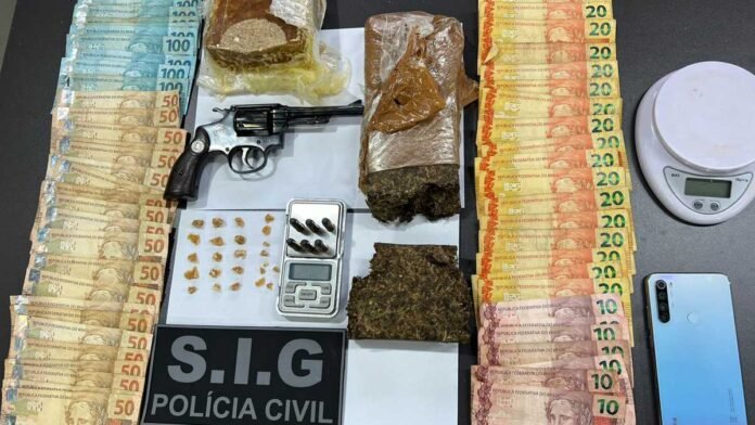 Diante da situação flagrancial foi realizada incursão no imóvel, oportunidade em que foram encontrados em posse do investigado 1 pedra bruta de crack, pesando aproximadamente 543 gramas; 28 porções de crack, pesando 8 gramas; dois tabletes de maconha, as quais pesaram 689 gramas; 2 balanças de precisão; 1 revólver, cal. 32, municiado e cédulas de dinheiro nacional, fracionadas. O homem foi autuado em flagrante e confessou a prática dos crimes.