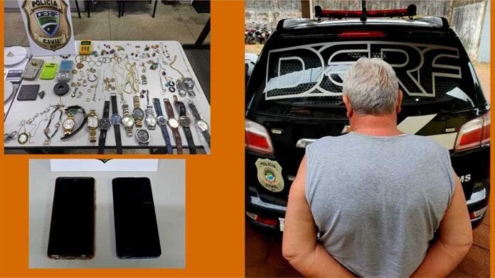 Delatado por autores de roubos e furtos de joias em residências e indicado pela alcunha de “Velho do ouro” ou “Carioca”, um comerciante de 62 anos de idade, suspeito de ser um dos maiores receptadores de joias de ouro de origem criminosa da Capital, foi alvo de operação da Polícia Civil do Mato Grosso do Sul, desencadeada nesta quarta-feira, 26/04 e executada pela Delegacia Especializada em Repreensão a Roubos e Furtos (DERF). O indivíduo foi preso em flagrante por posse irregular de munições.