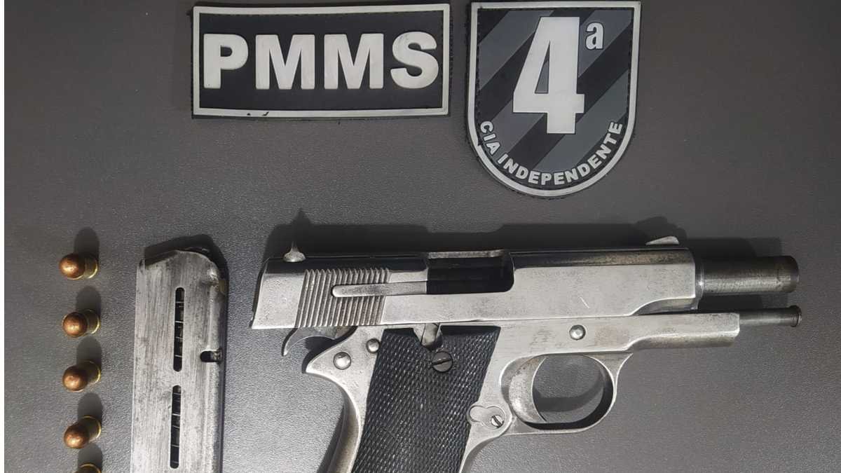 Os militares deslocaram até o local dos fatos, deram voz de prisão ao autor e encontraram a arma de fogo, uma pistola calibre 380, com um carregador e seis munições intactas. A equipe de perícia compareceu no local e recolheu uma munição deflagrada.