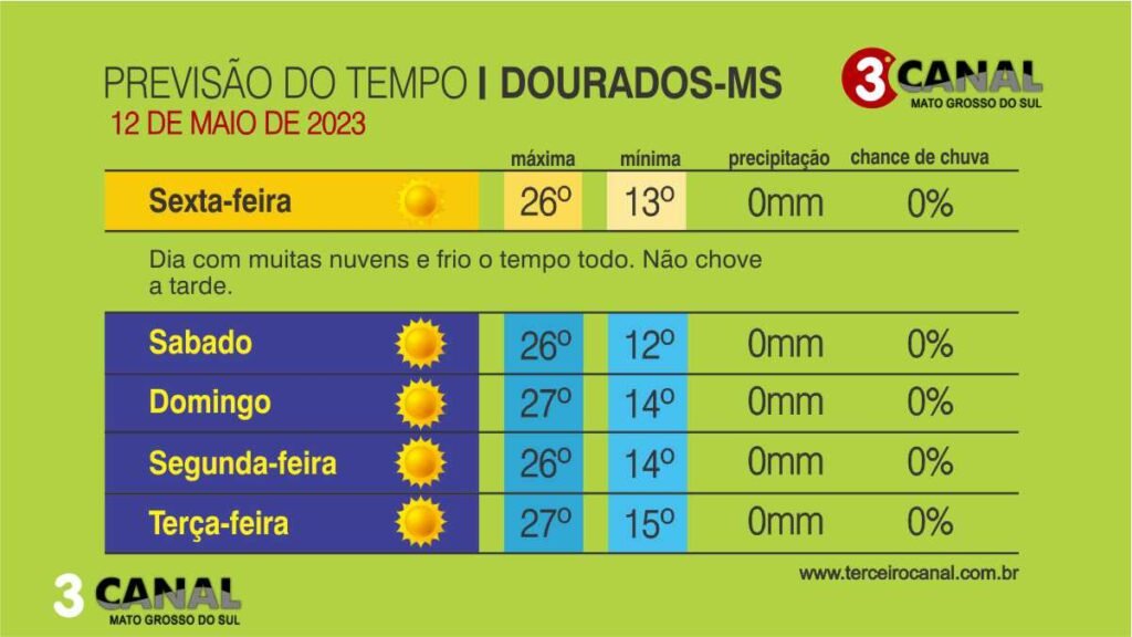 Ainda segundo o Cemtec, em Campo Grande, a mínima será de 19ºC e a máxima de 27ºC. Em Dourados, mínima de 13ºC e máxima de 26ºC. No Sul, onde as temperaturas serão as mais baixas no Estado, Ponta Porã terá mínima de 15ºC e máxima de 26ºC; Iguatemi fica com mínima de 14°C e máxima de 26°C. No Bolsão, Três Lagoas terá mínima de 20°C e máxima de 30°C.