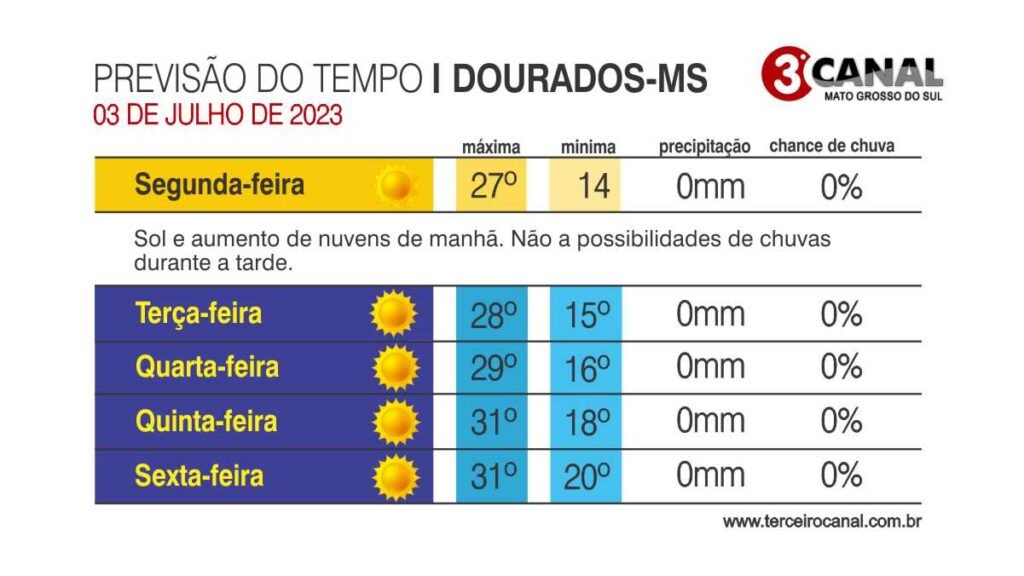 Previsão do tempo para esta segunda-feira 03/07 a sexta-feira 07/07 em Dourados