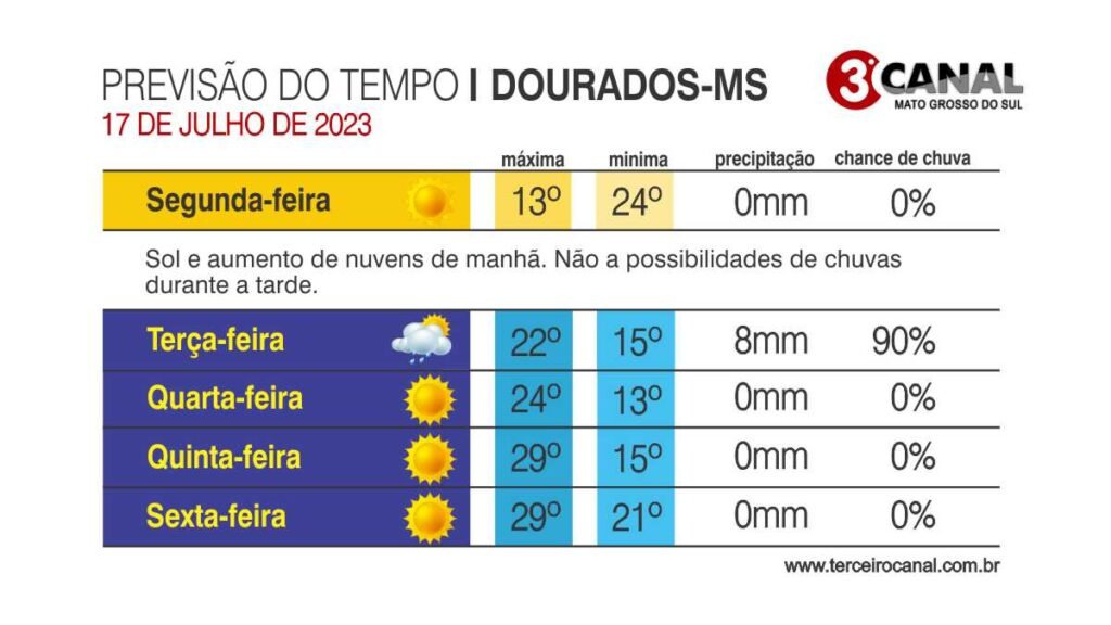 A previsão da meteorologia é de chuva em alguns municípios do Estado neste início de semana. Mundo Novo, Amambai, Bela Vista, Porto Murtinho e Bonito, devem ter chuva nesta segunda-feira. Já no restante do Estado, a previsão é de que as temperaturas mínimas fiquem entre 15°C e 17°C e as máximas entre 27°C e 32°C.