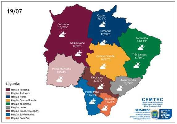 Em Porto Murtinho, Dourados, Ponta Porã, Iguatemi e Anaurilândia as temperaturas variam entre a mínima de 12°C (Iguatemi) e a máxima de 24°C (Porto Murtinho e Anaurilândia). Na região de Dourados, a temperatura varia entre 16°C e 23°C.