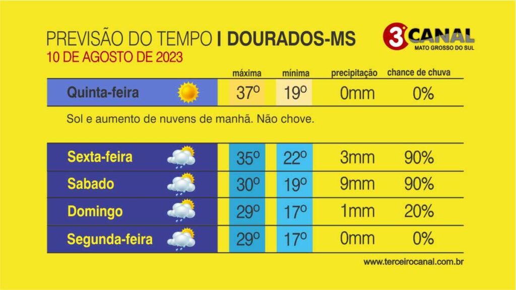 Em Campo Grande, a mínima será de 23°C e a máxima de 35°C. Em Dourados, 19°C pela manhã e 37ºC pela tarde. No leste do Estado, em Anaurilândia, os termômetros marcam 19°C inicialmente e sobem até os 36ºC. No Conesul, Iguatemi registra mínima de 18°C e máxima de 34°C.