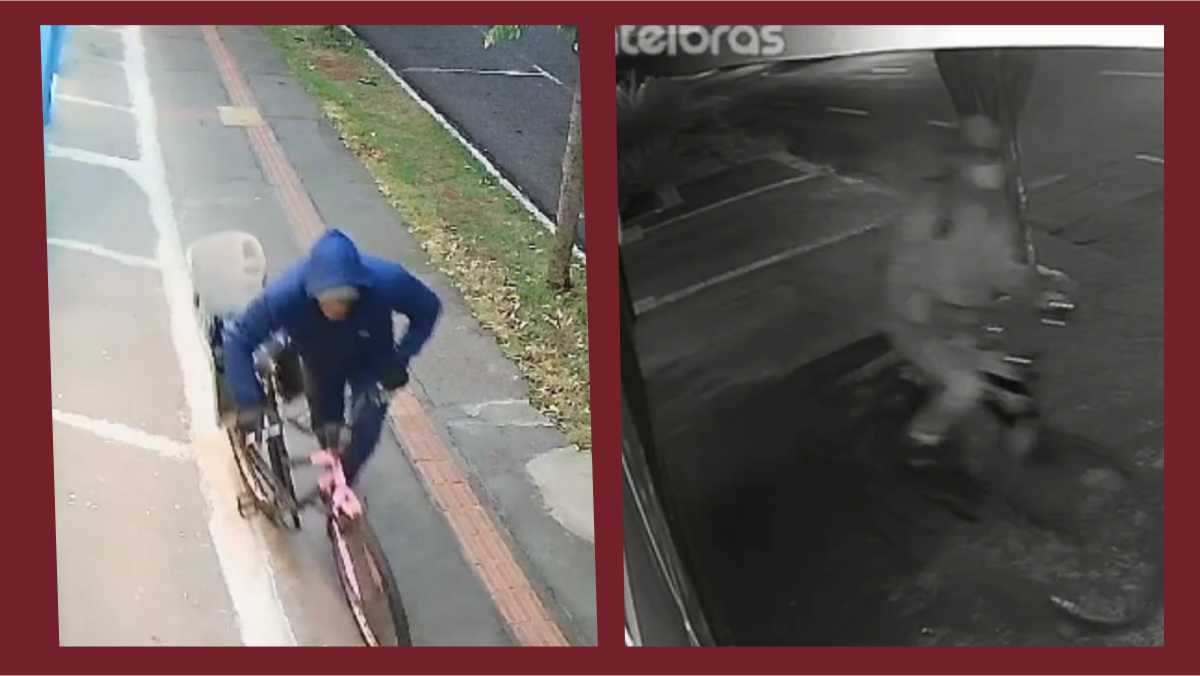O primeiro caso foi gravado pelas câmeras de segurança de uma loja no centro da cidade na rua Paranaíba, é possível ver o indivíduo chegando em uma bicicleta Caloi Poty, de cor preta e rosa com uma cadeirinha para criança.