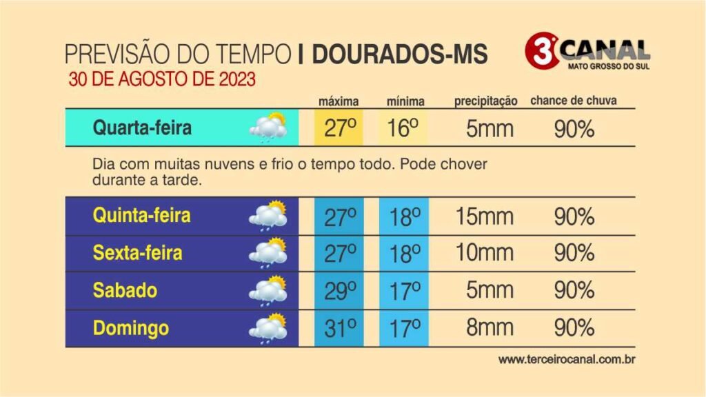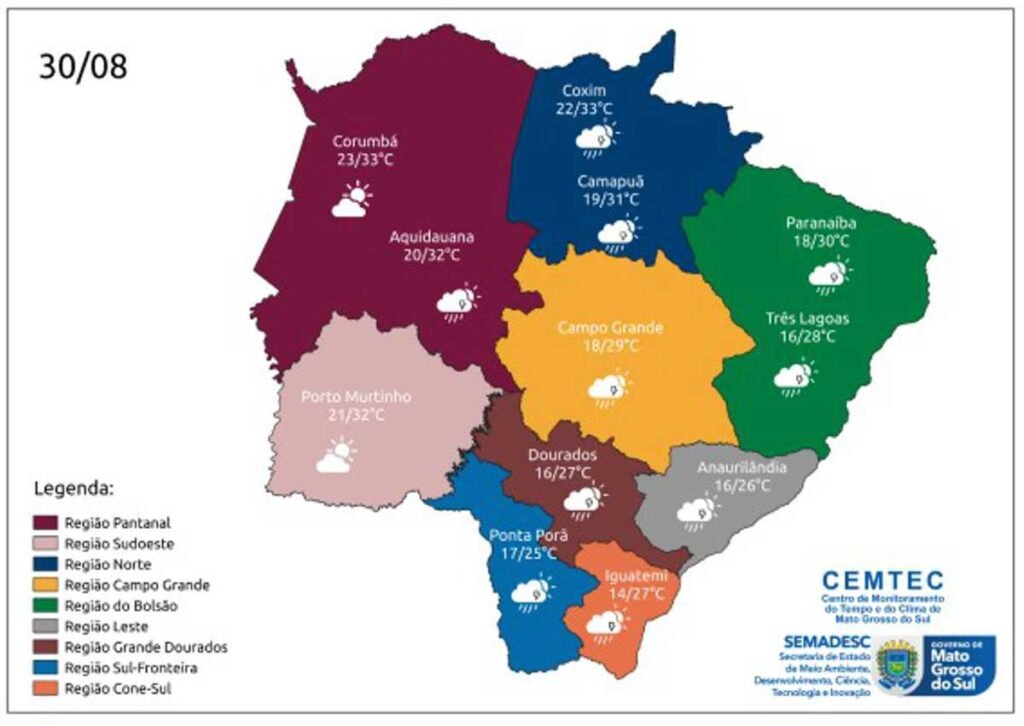 A previsão do Cemtec (Centro de Monitoramento do Tempo e do Clima) para esta quarta-feira (30) é de probabilidade de chuvas de intensidade fraca a moderada em grande parte de Mato Grosso do Sul. Além disso, podem ocorrer, localmente, tempestades com raios e rajadas de vento.