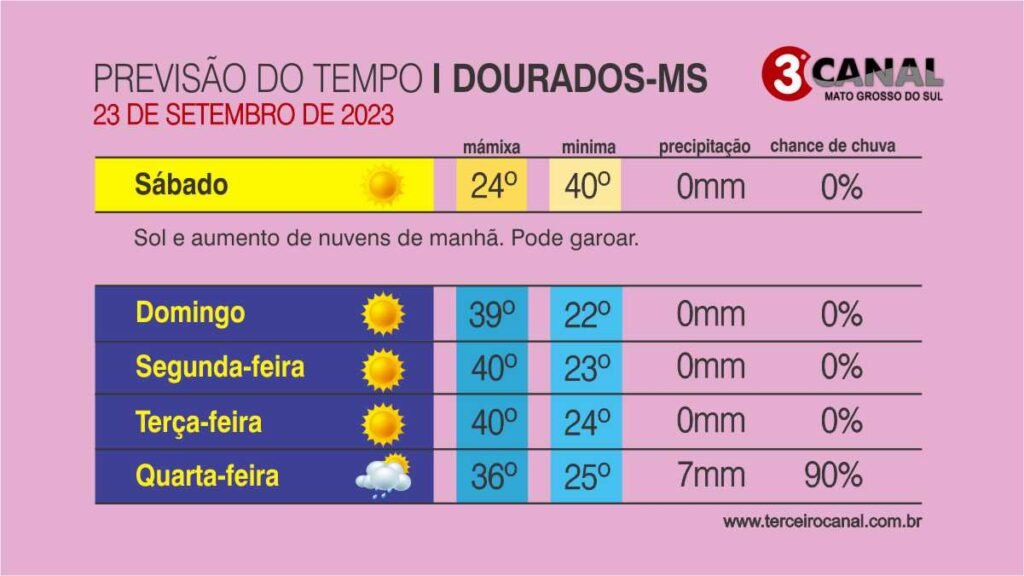 Previsão do tempo para este sábado 23/09 a quarta-feira 27/09 em Dourados e região