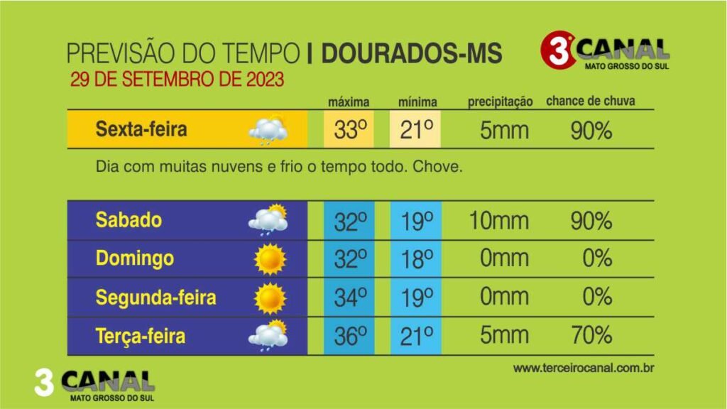 A previsão do Cemtec (Centro de Monitoramento do Tempo e do Clima) para esta sexta-feira (29) indica aumento das temperaturas em grande parte de Mato Grosso do Sul. Além disso, devido ao avanço de uma frente fria oceânica, de fraca intensidade, aliada ao aquecimento diurno devem ocorrer chuvas e tempestades acompanhadas de raios e rajadas de vento.