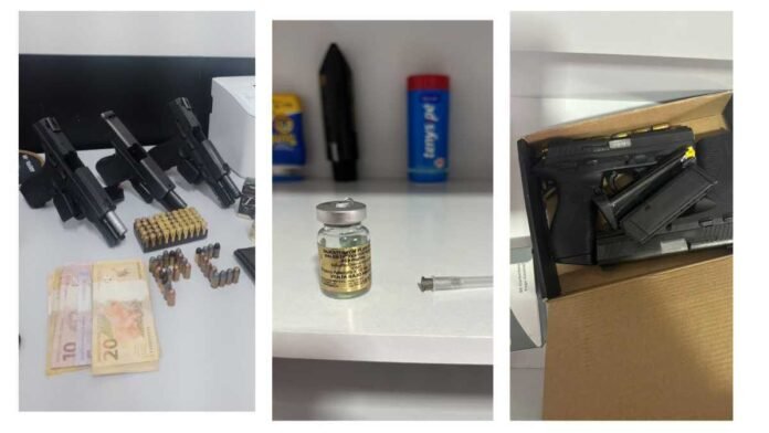 Frente às evidências de flagrante delito, foi realizada busca na casa do indivíduo, onde foram apreendidas: duas armas, sendo uma pistola calibre .380 e uma calibre 9mm; munições 9mm e .380, no total de 81 e duas ampolas de anabolizantes provindas do Paraguai, além de documentação indicando a prática de agiotagem.