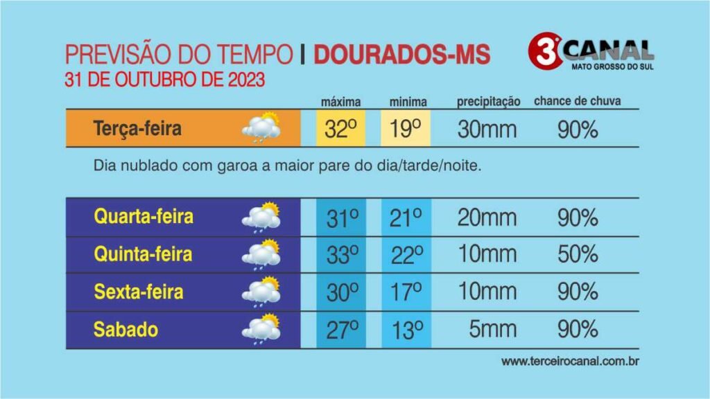 De acordo com o Cemtec, Campo Grande deve registrar mínima de 25°C e máxima de 32°C. Em Dourados, os termômetros marcam inicialmente 19°C e atingem 32°C. Nas regiões Sul-Fronteira e Cone-Sul, Ponta Porã e Iguatemi iniciam o dia aos 21°C e chegam aos 28°C no período da tarde. Anaurilândia, no Leste do estado, apresenta variação entre 23°C e 31°C.