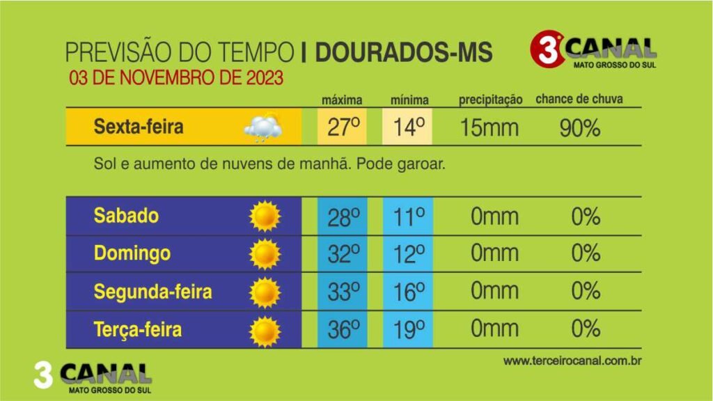 A previsão do Cemtec (Centro de Monitoramento do Tempo e do Clima) para esta sexta-feira (3) indica tempo instável, com possibilidade de chuvas de intensidade fraca a moderada. Além disso, pontualmente podem ocorrer também chuvas intensas e tempestades acompanhadas de raios, rajadas de vento e eventual queda de granizo.