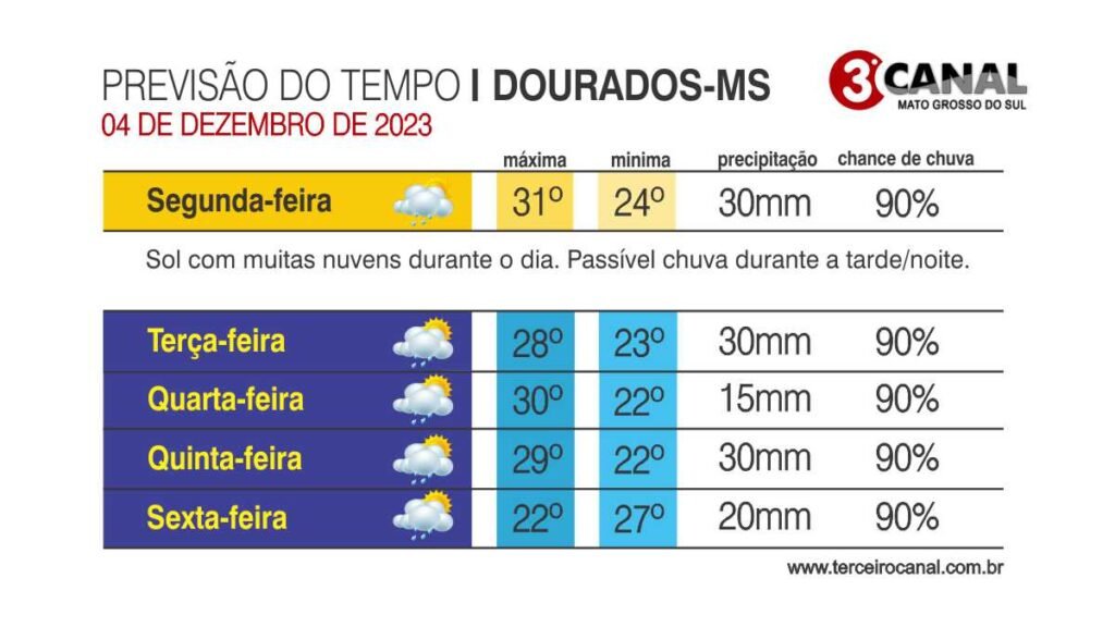 Previsão do tempo para esta segunda-feira 04/12 a sexta-feira 08/12 em Dourados e região