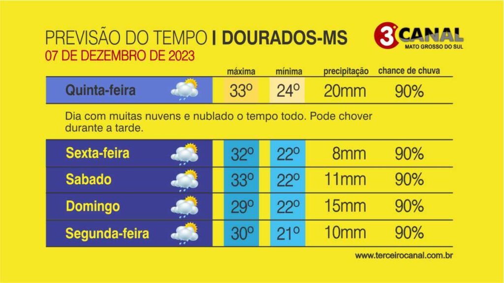 A previsão do Cemtec (Centro de Monitoramento do Tempo e do Clima) para esta quinta-feira (7) indica a permanência de tempo instável em grande parte de Mato Grosso do Sul devido a aproximação de uma nova frente fria.
