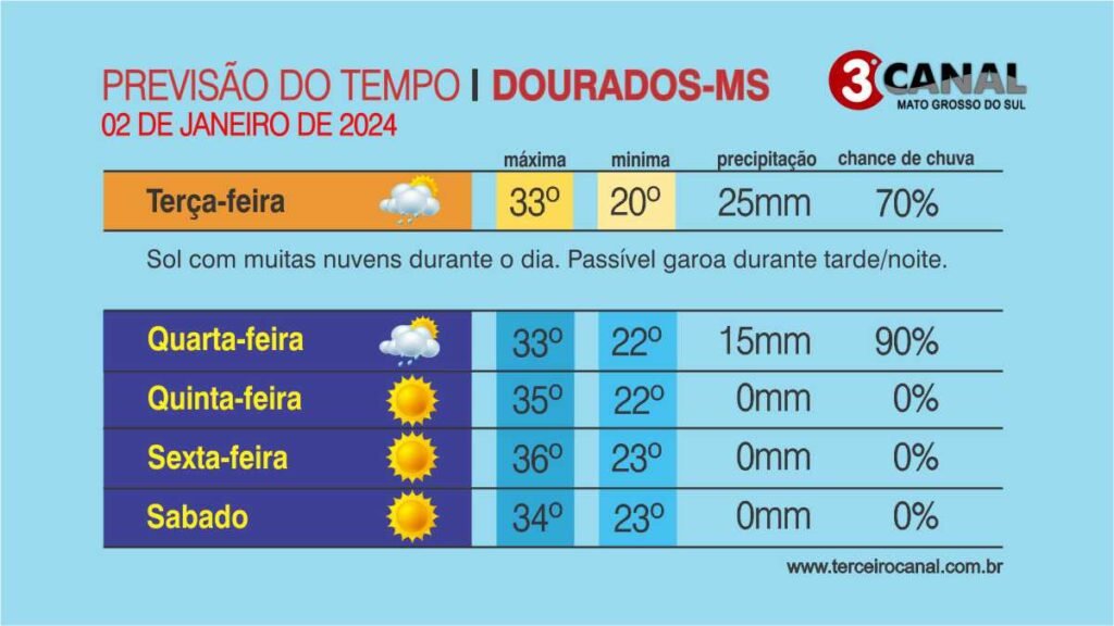 Previsão do tempo para esta terça-feira 02/01 2024 a sábado 04/01/24 em Dourados e região