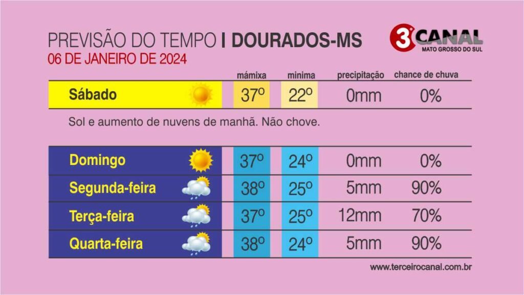 Em Campo Grande, os termômetros registram 23°C inicialmente e atingem 33°C ao longo do dia. Em Dourados, a mínima é de 22°C e a máxima é de 37°C. Na fronteira com o Paraguai, Ponta Porã amanhece com 20°C e marca 35°C pela tarde. Iguatemi, no Cone-Sul, tem mínima de 21°C e máxima de 36°C.