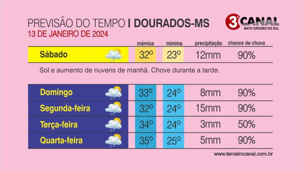 Para sábado, a previsão é de temperatura mínima de 22°C e máxima de 32°C nas regiões do Bolsão e norte de Mato Grosso do Sul. Já na porção mais ao sul e no leste, a temperatura deve oscilar entre 22°C e 31°C, enquanto na região pantaneira e sudoeste fica entre 24°C e 34°C.
