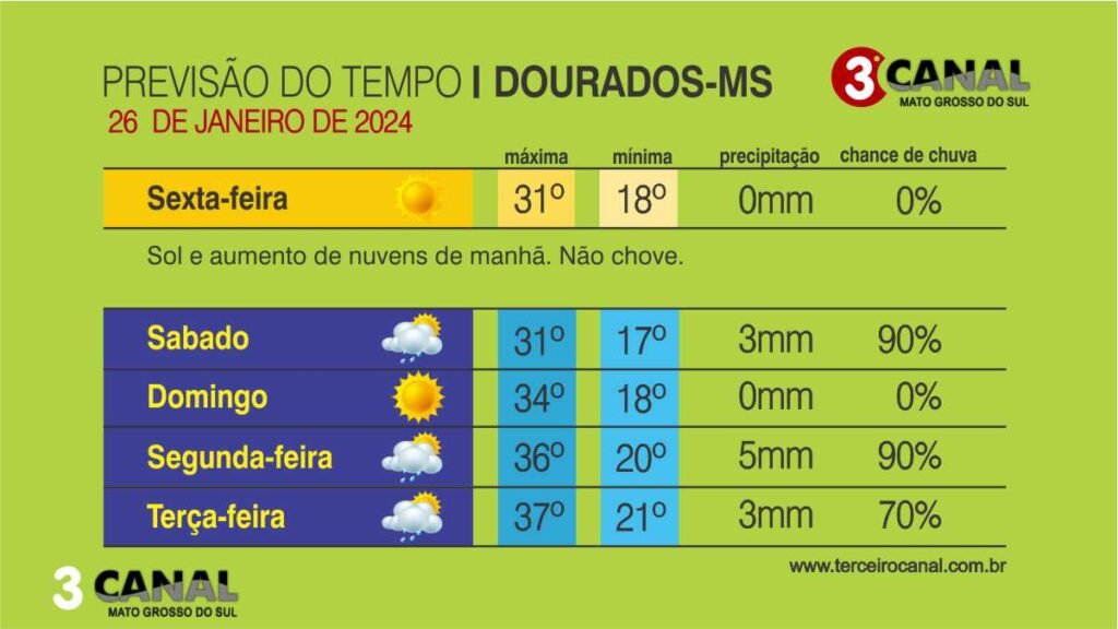 Previsão do tempo para esta sexta-feira 26/01 a terça-feira 30/01 em Dourados e região