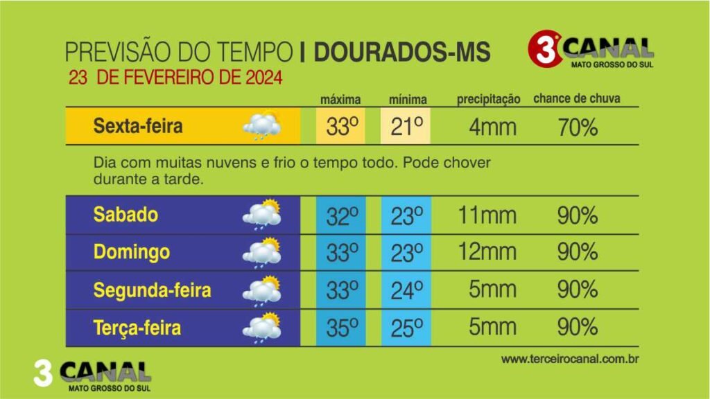 Previsão do tempo para esta sexta-feira 23/02 a terça-feira 27/02 em Dourados e região