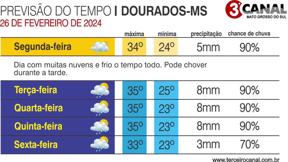 Previsão do tempo para esta segunda-feira 26/02 a sexta-feira 01/03 em Dourados
