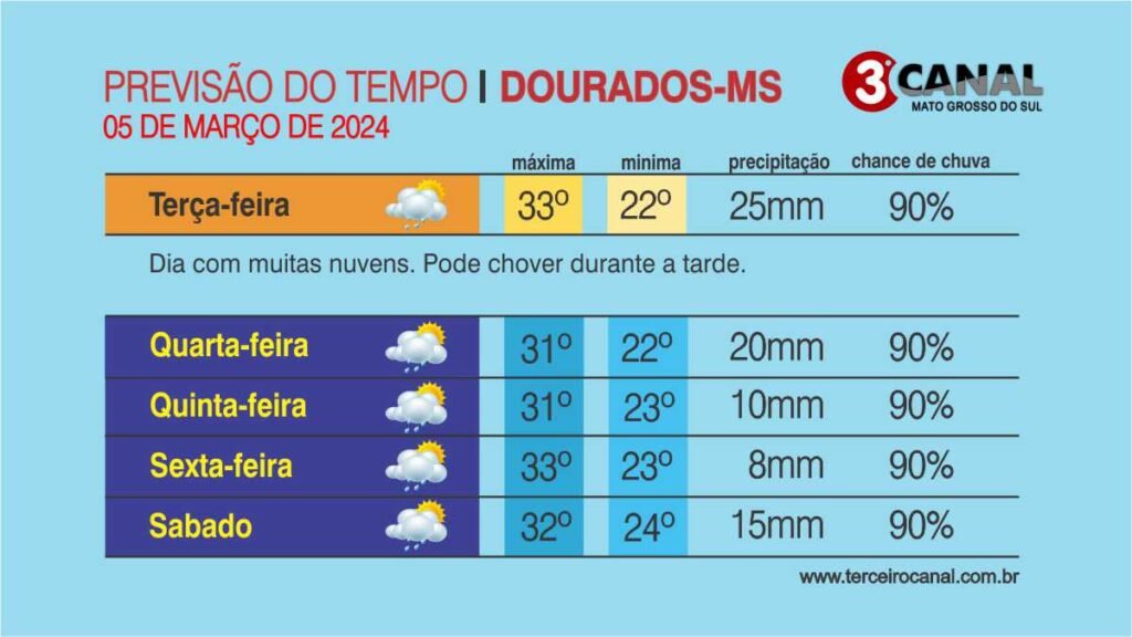 Em Campo Grande, os termômetros marcam 23°C inicialmente e atingem 31°C ao longo do dia. Dourados tem mínima de 22°C e máxima de 33°C. Na fronteira com o Paraguai, Ponta Porã apresenta variação entre 22°C e 29°C. Em Anaurilândia, na região Leste, a mínima é de 24°C e a máxima chega aos 35°C.