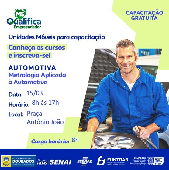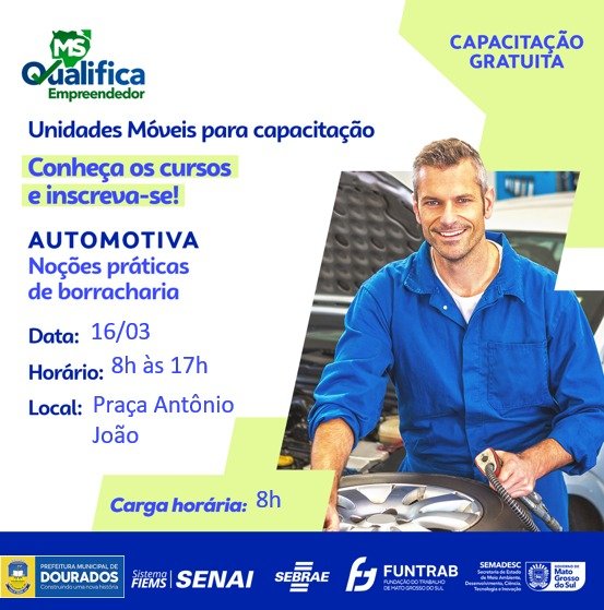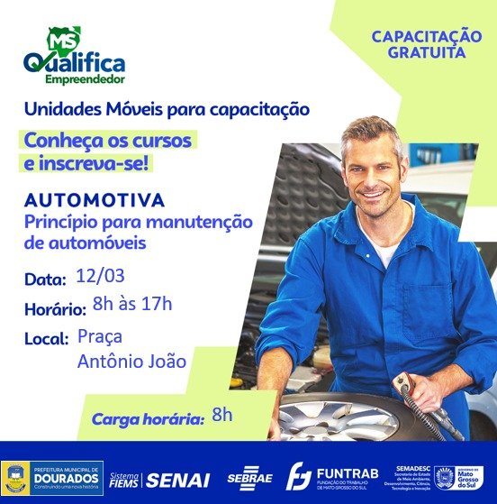 A Prefeitura de Dourados avança com os serviços do Programa ‘Cidade Empreendedora’ e, entre os dias 11 e 16 de março, realiza uma capacitação automotiva gratuita para toda a população, com diversos módulos como mecânica, elétrica, borracharia, manutenção, entre outros.