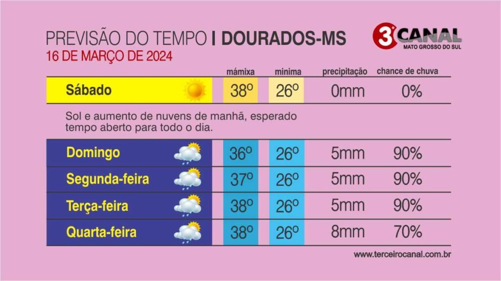 Em Campo Grande, a mínima é de 25°C e a máxima de 35°C. Os termômetros em Dourados marcam 26°C inicialmente e atingem 38°C. Nas regiões Sul-Fronteira e Cone-Sul, Ponta Porã e Iguatemi apresentam mínimas de 26°C e máximas de 35°C e 37°C, respectivamente.