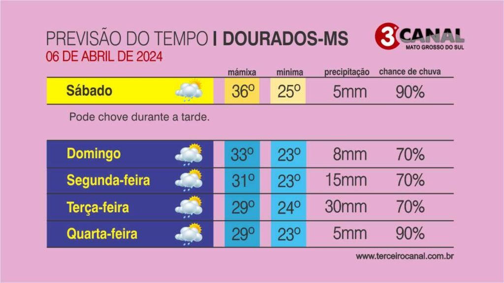 Previsão do tempo para este sábado 06/04 a quarta-feira 10/04 em Dourados e região