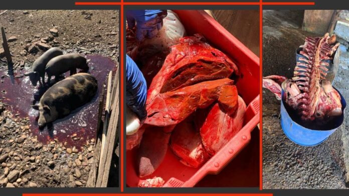 A primeira prisão ocorreu quando A.D.F., de 47 anos, estava realizando o abate ilegal de um bovino em uma chácara que servia como frigorífico clandestino. No local, foram encontradas diversas carcaças espalhadas pela propriedade, contendo carne de ovinos, suínos e bovinos, totalizando 1.525 quilos de carne imprópria para consumo.
