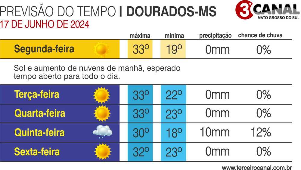 A previsão para a semana, em grande parte do Estado, indica continuidade do tempo firme com sol e variação de nebulosidade. De acordo com o Cemtec (Centro de Monitoramento do Tempo e do Clima de Mato Grosso do Sul, esta condição meteorológica ocorre devido a atuação de uma massa de ar quente e seca que inibe a formação de nuvens e chuvas, favorecendo o tempo quente e mais seco no Estado.