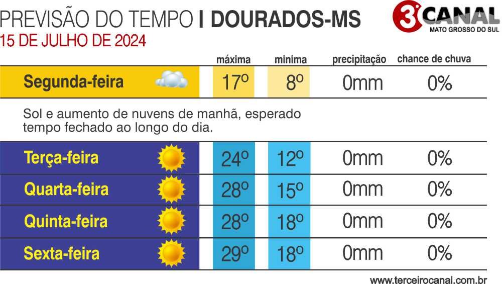 Nesta segunda-feira (15), a mínima prevista em Campo Grande é de 10°C e a máxima de 22°C. Em Dourados, o dia inicia com 8°C e chega aos 17°C nos horários mais quentes. Na região Sul-Fronteira, Ponta Porã registra 5°C pela manhã e 14°C à tarde. Anaurilândia, no leste, tem mínima de 10°C e máxima de 22°C.