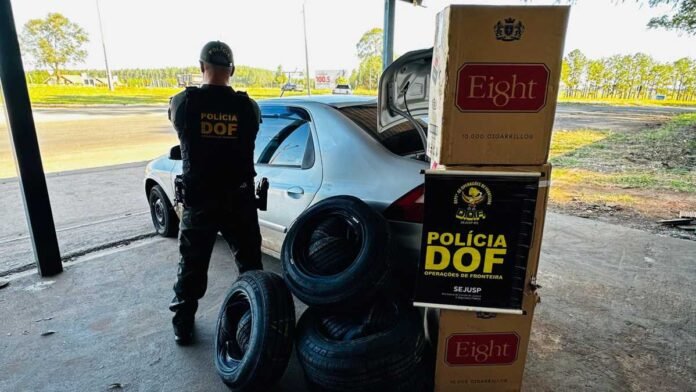 Policiais militares do DOF (Departamento de Operações de Fronteira) apreenderam um veículo GM Prisma carregado com 20 pneus e 150 pacotes de cigarros. Na ação ninguém foi preso.