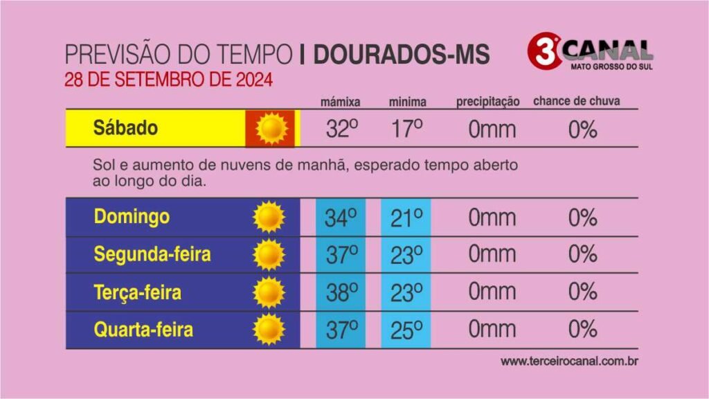 Segundo o Cemtec (Centro de Monitoramento do Tempo e do Clima de MS), este tempo firme ocorre devido a atuação da alta pós-frontal. As temperaturas mínimas previstas ficam entre 15-17°C, enquanto que as máximas chegam a 25-32°C nas regiões sul e sudeste do Estado.