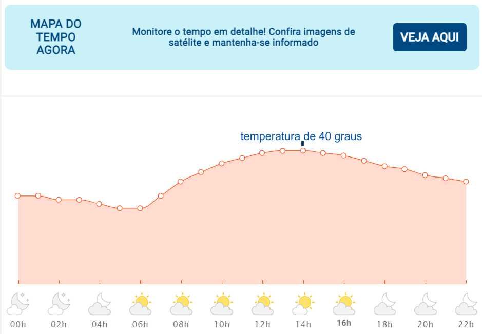 Ao longo do final de semana as temperaturas estarão em elevação, podendo atingir valores entre 38-43°C, aliado a baixos índices de umidade relativa do ar, entre 8% e 30%.