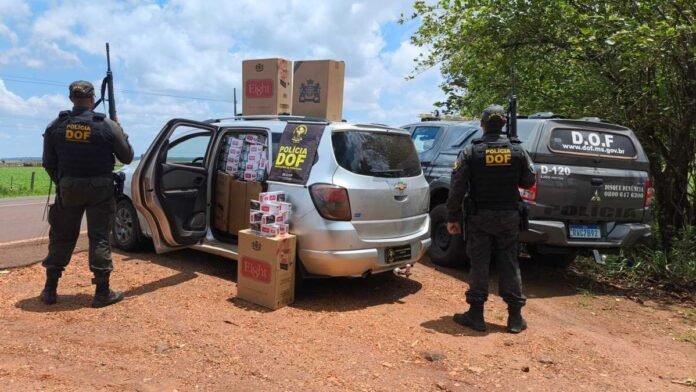 Policiais militares do DOF (Departamento de Operações de Fronteira) apreenderam, na manhã desta segunda-feira (21), um veículo GM Spin carregado com 1.250 pacotes de cigarros contrabandeados do Paraguai.