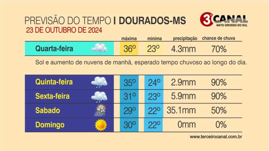 Segundo o Cemtec (Centro do Monitoramento do Tempo e Clima de MS), na quarta-feira (23) a previsão é de tempo com sol, possibilidade de pancadas de chuva e tempestades devido a atuação de área de baixa pressão atmosférica, aliado com a presença do a quente e úmido.