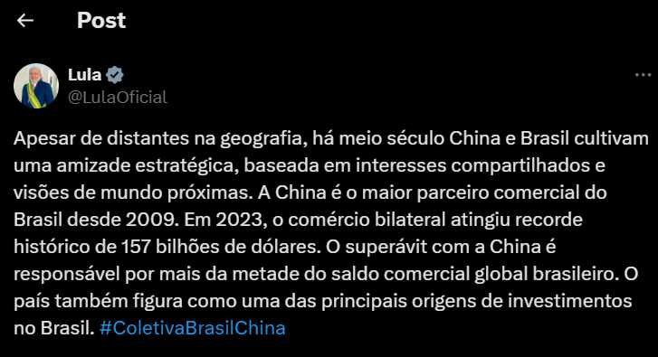 “Sendo os dois maiores países em desenvolvimento, em seus respectivos hemisférios, China e Brasil devem assumir proativamente a grande responsabilidade histórica de salvaguardar os interesses comuns dos países do Sul Global e de promover uma ordem internacional mais justa e equitativa. Vamos aprofundar a cooperação em áreas prioritárias como economia e comércio, finanças, ciência e tecnologia, infraestrutura e produção ambiental. E reforçar a cooperação em áreas emergentes, como transição energética, economia digital, interagência artificial e mineração verde”, afirmou Xi Jinping, durante sua declaração.