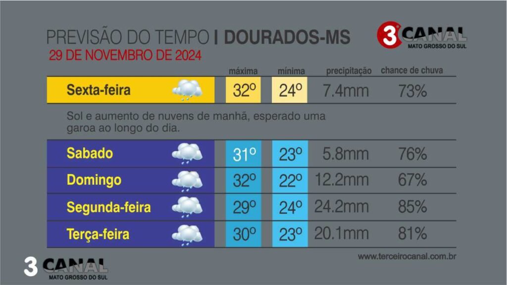 Na sexta-feira (29) a previsão indica tempo com sol, aumento de nebulosidade e chuva de intensidade fraca a moderada, e pontualmente podem ocorrer chuvas mais intensas e tempestades acompanhadas de raios e rajadas de vento. “Essa situação meteorológica ocorre devido ao intenso transporte de calor e umidade. Além disso, a atuação de uma área de baixa pressão atmosférica sobre o Paraguai, e a aproximação de uma frente fria favorecem a formação de instabilidades no Estado”, explicou Valesca Fernandes, meteorologista e coordenadora do Cemtec (Centro de Monitoramento do Tempo e do Clima).