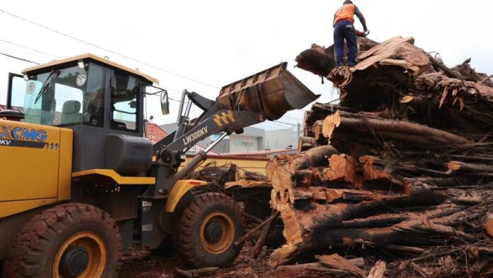 A remoção iniciada nesta segunda-feira já abrangeu cerca de 40% do tronco. Os resíduos estão sendo destinados para o depósito de galhos da Prefeitura. Apesar do rápido andamento do trabalho, fatores climáticos podem impactar na remoção, conforme explica o coordenador da Defesa Civil, Johnes Aniceto Santana.
