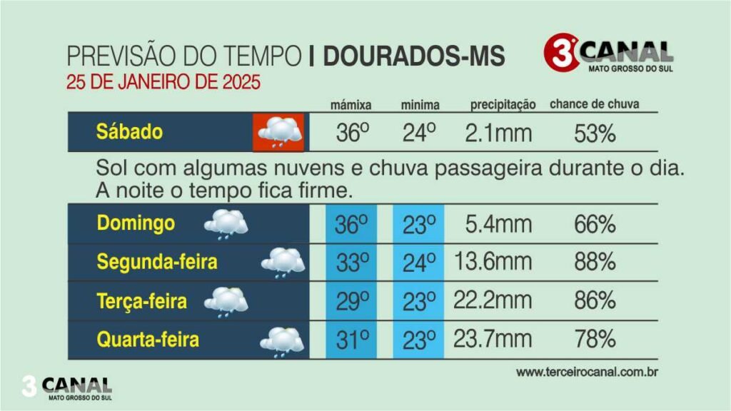 A previsão indica sol e variação de nebulosidade neste sábado (25) e domingo (26). Porém, há possibilidade para chuvas de intensidade fraca a moderada. E pontualmente, podem ocorrer chuvas mais intensas e tempestades acompanhadas de raios e rajadas de vento. Essa situação meteorológica ocorre devido a aproximação e o avanço de uma frente fria, aliado a atuação de uma área de baixa pressão atmosférica. Além disso, o aquecimento diurno e umidade favorecem a formação de instabilidades no Estado. Por outro lado, hoje (25) são esperadas altas temperaturas com valores entre 37°C e 40°C e baixos valores de umidade relativa do ar entre 20% e 35%, principalmente nas regiões pantaneira e sudoeste.