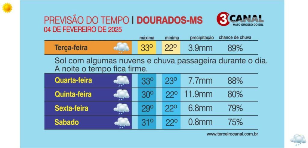 Previsão do tempo para esta terça-feira 04/02 a sábado 08/02 em Dourados e região