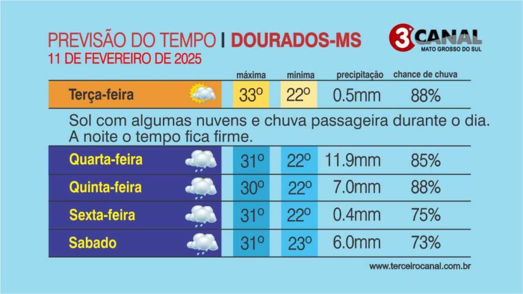 Na Capital a variação será de 23°C (mínima) e 33°C (máxima). Já em Dourados fica entre 22°C e 33°C. Na cidade de Ponta Porã, na região de fronteira, a máxima será de 34°C e mínima de 28°C. Em Corumbá, na região pantaneira, a mínima fica em 26°C e máxima de 31°C.