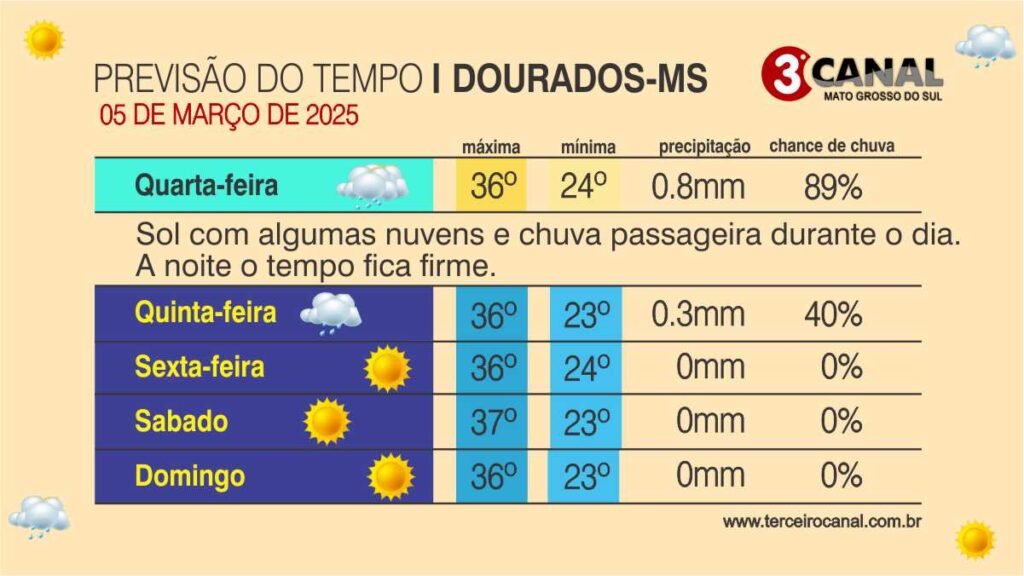 Previsão do tempo para esta quarta-feira 05/03 a domingo 09/03 em Dourados e região