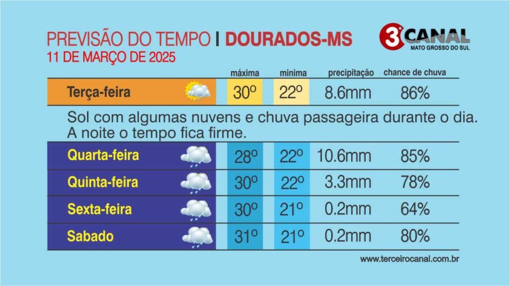 Com aquecimento diurno aliado a alta umidade, condições típicas de verão, Mato Grosso do Sul tem previsão de sol, seguido por aumento de nebulosidade e possibilidade de chuvas de intensidade fraca a moderada, a partir de ontem (10) até sábado (15).