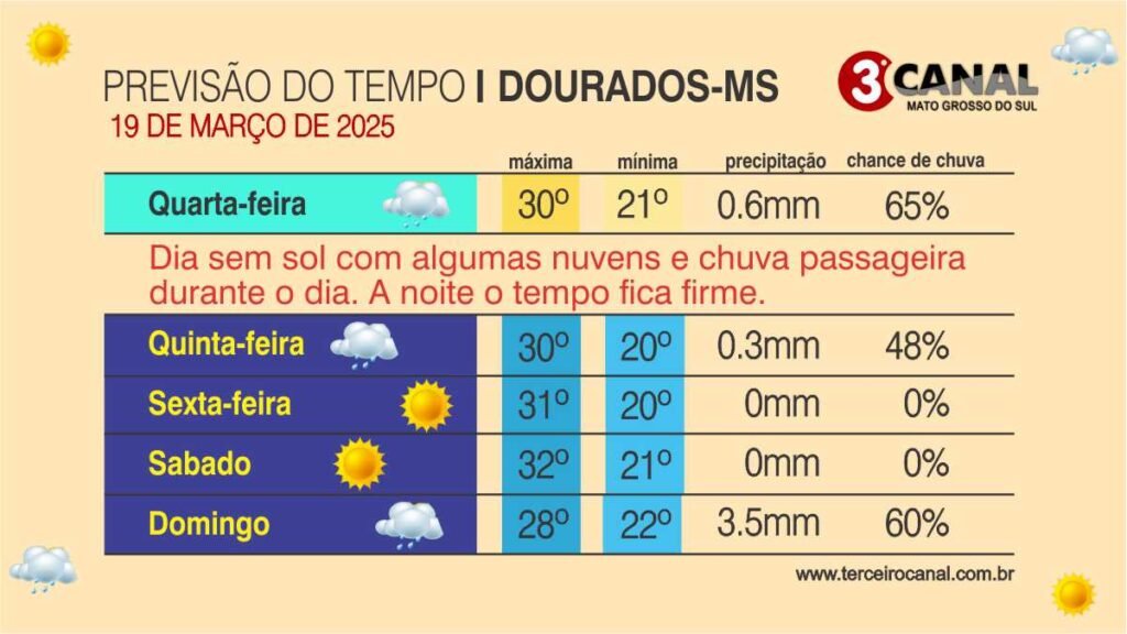 Com aquecimento diurno aliado a alta umidade, condições típicas de verão, Mato Grosso do Sul tem previsão de sol, seguido por aumento de nebulosidade e possibilidade de chuvas de intensidade fraca a moderada.