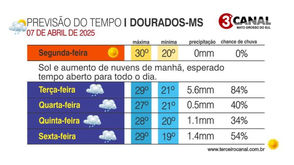 Em Campo Grande a mínima será de 22°C e máxima de 31°C. Já em Dourados vai variar entre 20°C e 30°C. Para região do Pantanal, em Corumbá, a máxima fica em 30°C e mínima de 22°C. Em Três Lagoas pode se chegar a 33°C, com mínima de 21°C. Na região de fronteira, em Ponta Porã, a variação será entre 18°C (mínima) e 27°C (máxima).