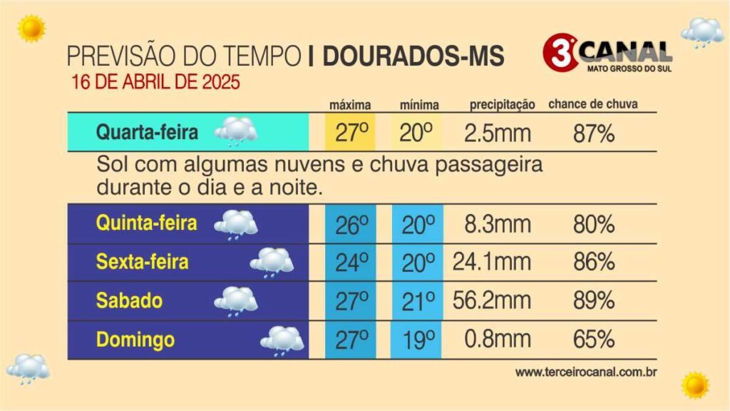 Segundo o Cemtec (Centro de Monitoramento do Tempo e do Clima de Mato Grosso do Sul), as mínimas serão de 16-18°C e máximas de 24-25°C nas regiões sul e sudeste. Já no sudoeste e Pantanal fica entre 22°C (mínima) e 30°C (máxima). No bolsão, leste e norte vai variar entre 20-22°C e 28-30°C. Na Capital a máxima chega a 29°C e mínima de 19°C.