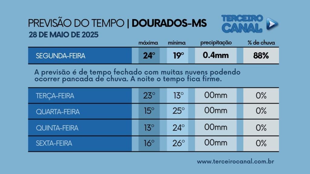 Porem em Dourados pode ocorrer chuvas principalmente entre a tarde e à noite. São previstas mínimas entre 18-20°C e máximas entre 25-28°C para as regiões sul e sudeste, assim como 23-25°C (mínimas) e 28-31°C (máximas) para regiões sudoeste e pantaneira . Para o bolsão, leste e norte ficará entre 20°C e 33°C. Na Capital a máxima chega a 29°C, com mínima de 21°C.